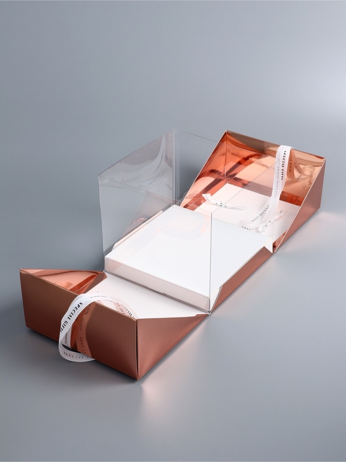 Картонные боковинки, открывающиеся как лепестки цветка, добавляют коробке изысканности и уникального шарма. Такое дизайнерское решение превращает распаковку торта в настоящий ритуал, наполненный магией и предвкушением наслаждения вкусом.