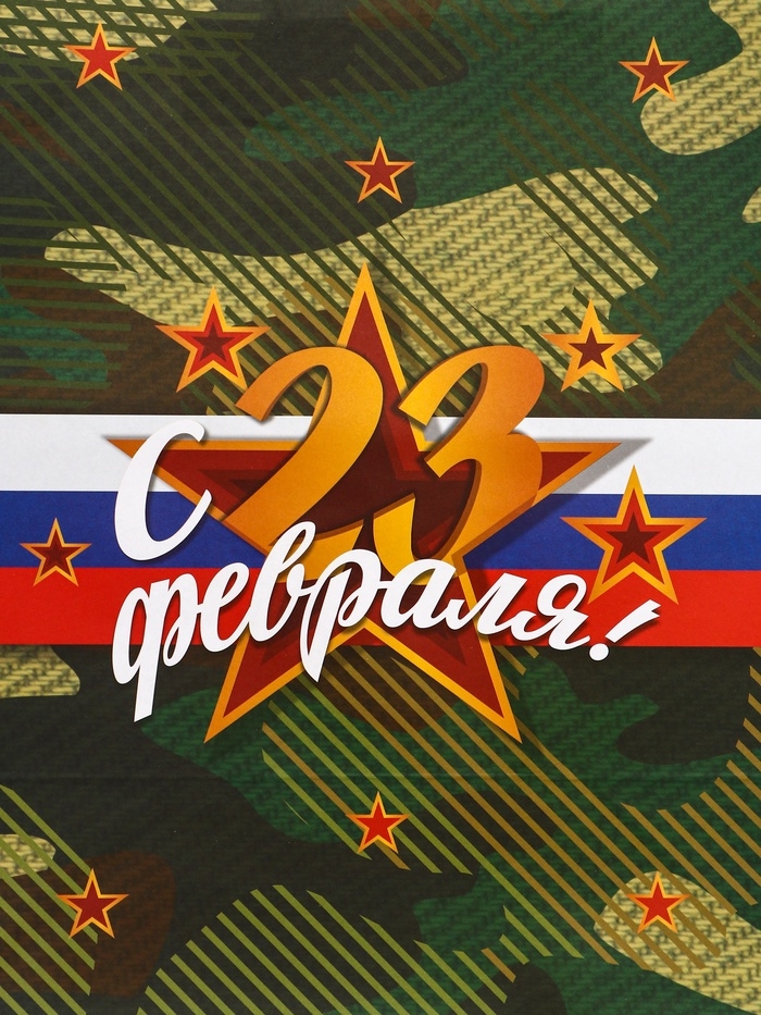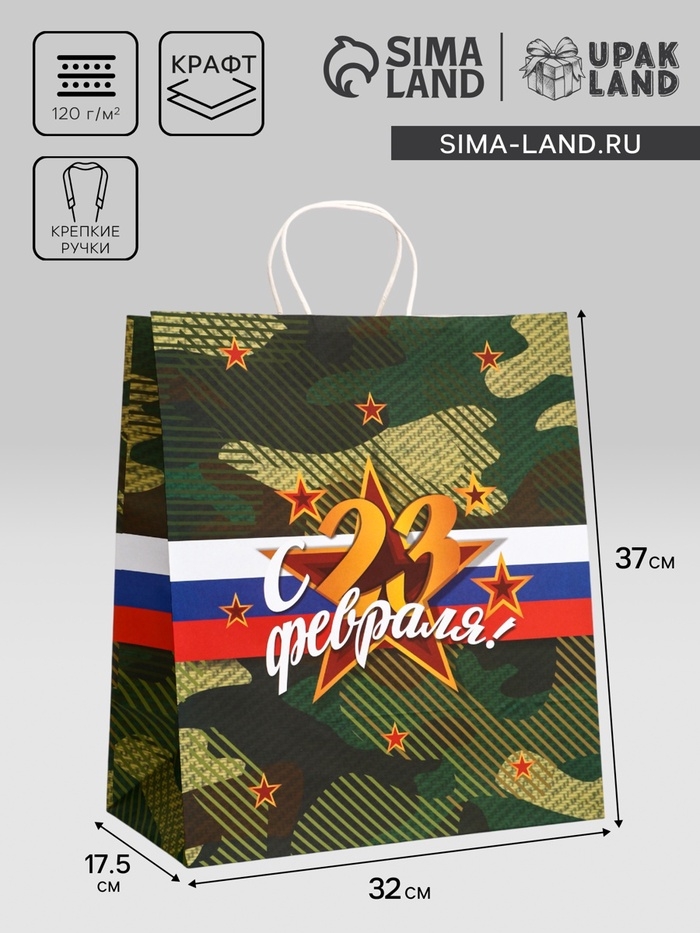 Пакет подарочный крафт "С 23 Февраля!" 32 х 17,5 х 37 См