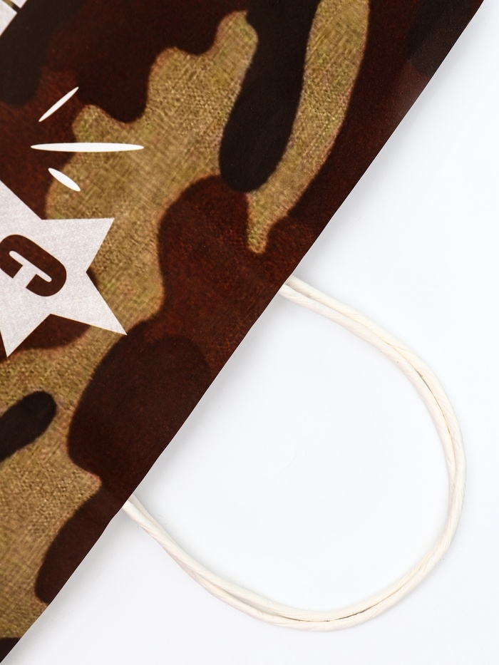 Этот крафтовый пакет с надписью "С 23 Февраля!" станет идеальным выбором для упаковки подарков на День защитника Отечества.