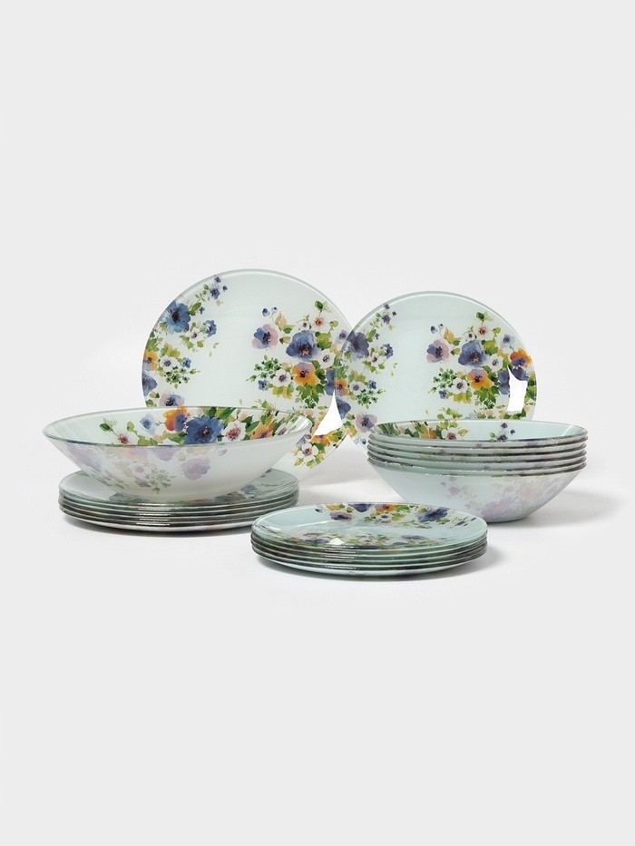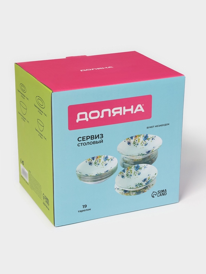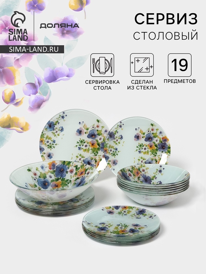 Столовый сервиз Доляна «Букет незабудок», 19 предметов: салатник 1 шт, тарелка десертная 6 шт, тарелка обеденная 6 шт, тарелка суповая 6 шт, стекло, рисунок