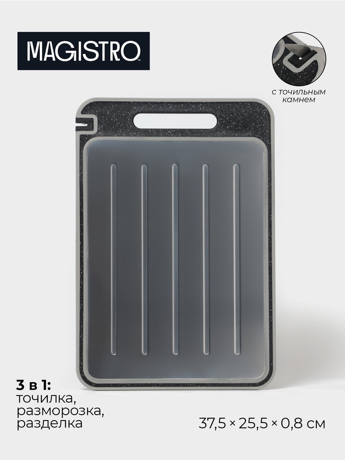 Многофункциональный инструмент, который сэкономит время и место на кухне. Доска Magistro 3 в 1 объединяет в себе удобную поверхность для разделки, эффективную систему размораживания и встроенную точилку для ножей, что делает её незаменимым помощником для каждой хозяйки.