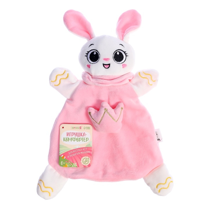 - Комфортер выполнен в форме зайца с ушками, которые удобно держать в маленьких ручках.