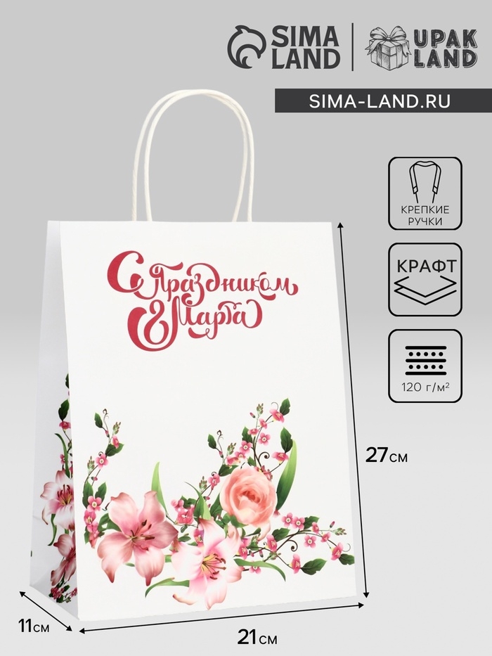 Этот пакет крафт на 8 Марта создан специально для того, чтобы сделать ваш подарок девушке ещё более особенным. Плотность бумаги 120 г/м² гарантирует прочность и надёжность пакета, позволяя безопасно переносить даже хрупкие и ценные вещи.