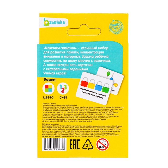 Задача ребёнка: совместить ключик с замочком по цвету. Внутри набора малыш обнаружит карточки с интересными заданиями.
