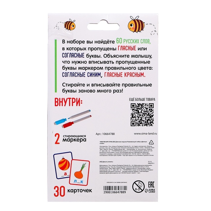 Развивающий набор для детей от 5 лет станет отличным помощником в изучении букв, слов и русского языка. Комплект включает 30 карточек с заданиями и два маркера, что делает процесс обучения интересным и интерактивным. Ребёнок тренирует внимание, чтение и грамматику, закрепляя знания в игровой форме.