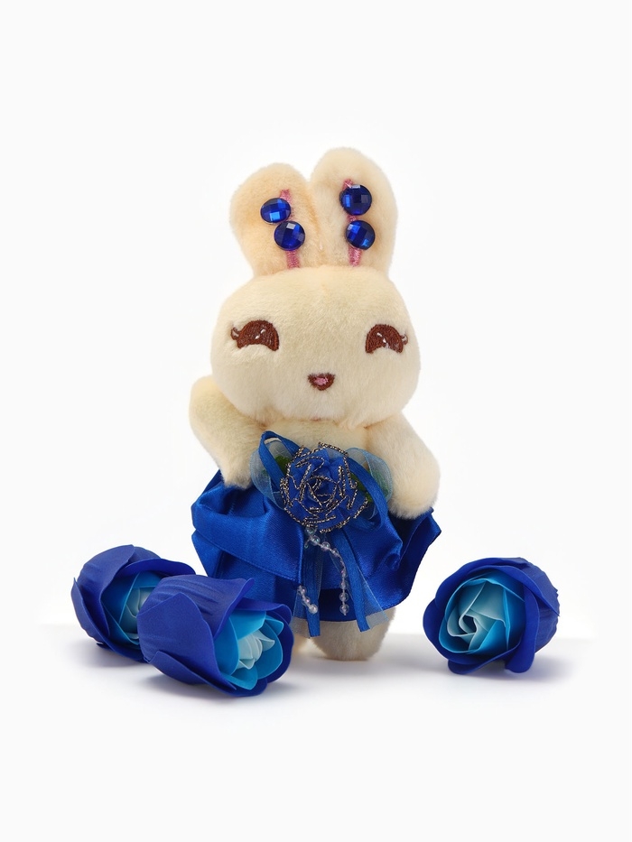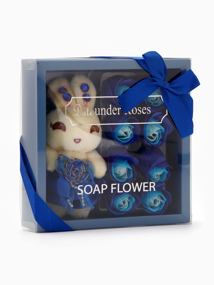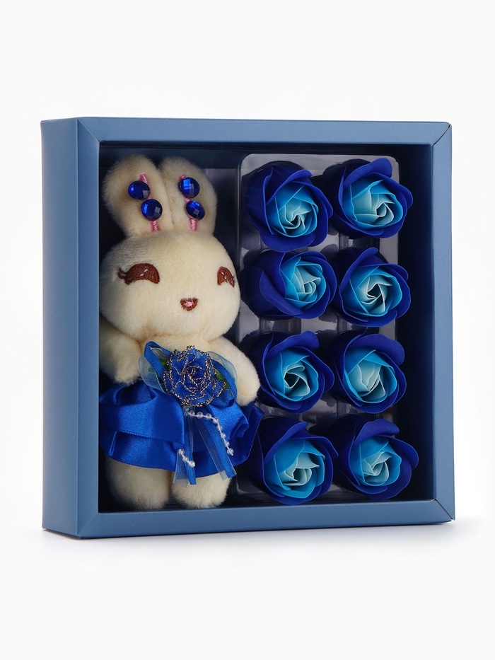 Набор мыльных роз в коробке 8 штук, бирюзово-белые с зайчиком