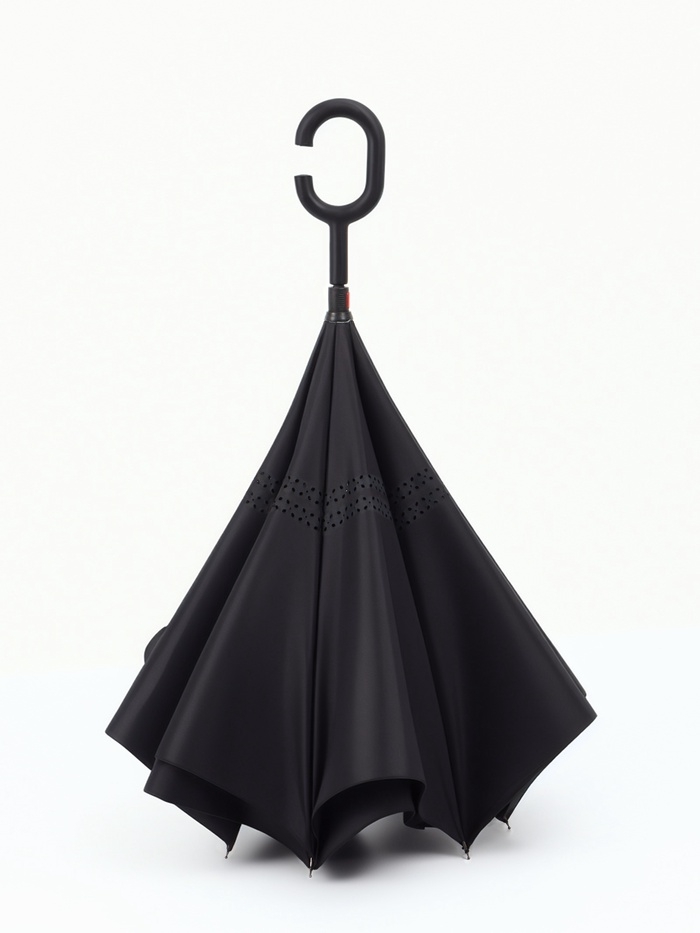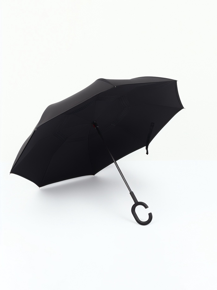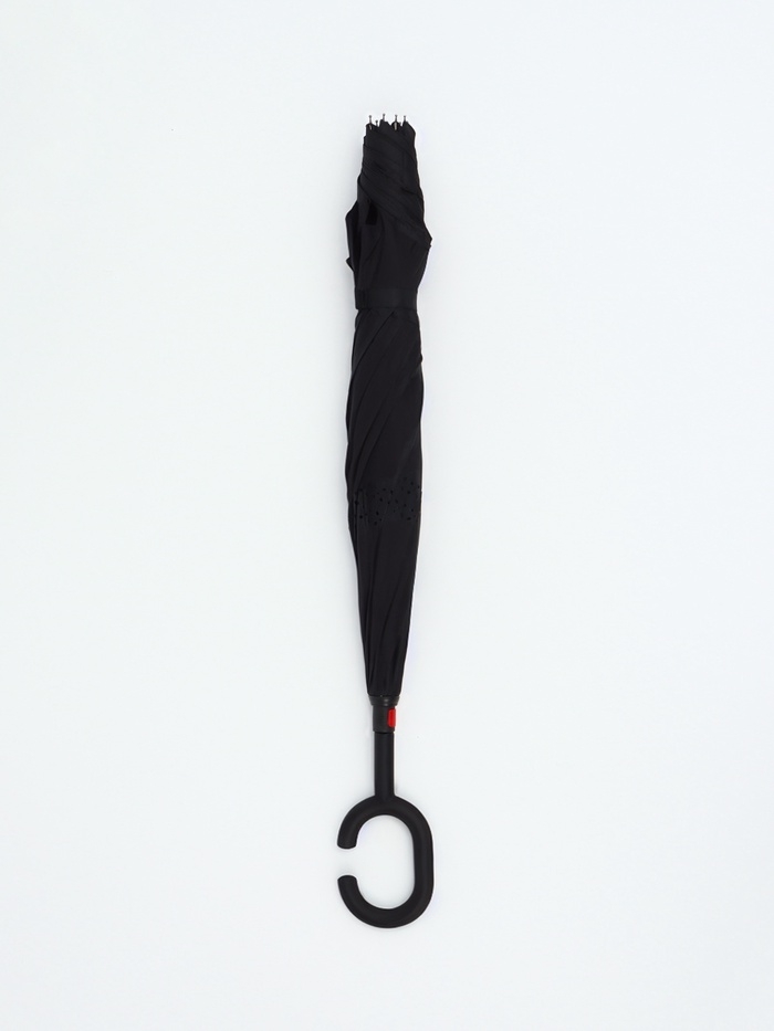 Необычный зонт будет Вашим верным помощником в дождливую погоду. Система данного зонта - механическая. От других моделей отличается механизмом обратного сложения. Зонт закрывается мокрой сторой внутрь. Конструкция задерживает воду в себе. При необходимости Вы легко сможете убрать зонт в сумку или на сидение автомобиля. Мокрых следов не останется! Купол зонта состоит из полиэстра. Потрясающая ручка удобно лежит в руке.