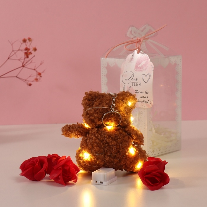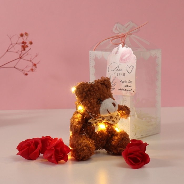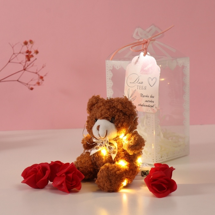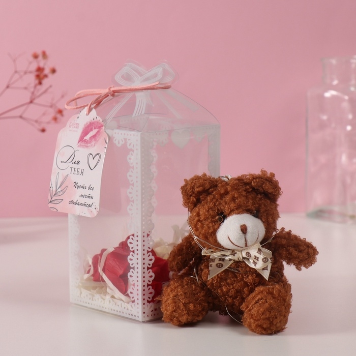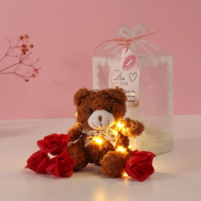 Набор подарочный "Мишка корица с бантом" мыльные красные розы 5 шт, роса 7х7х12 см