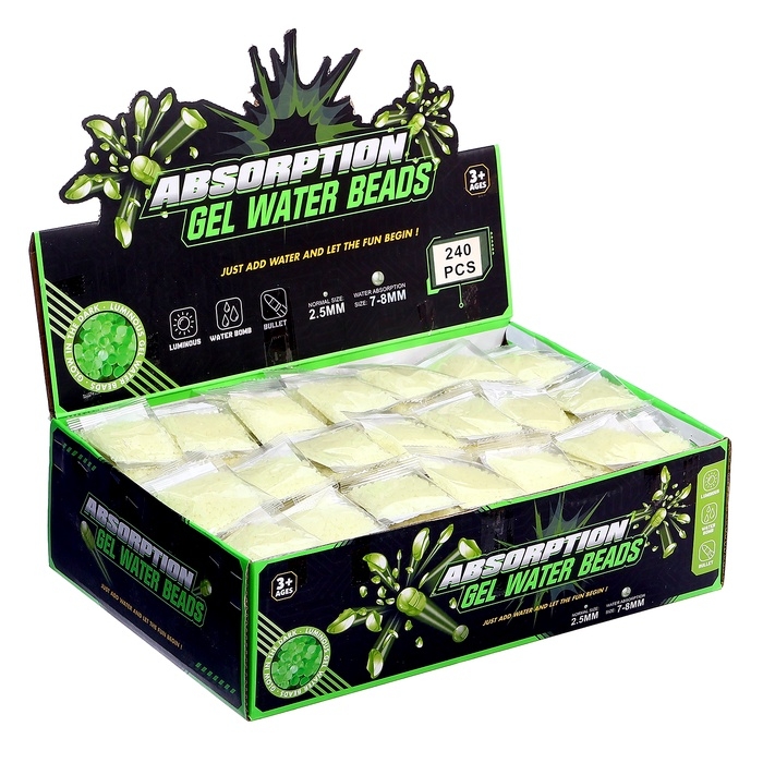 Эти светящиеся в темноте гидрогелевые пульки подарят детям массу удовольствия и станут отличным дополнением к любым играм с игрушечным оружием. Они увеличиваются до нужного размера после замачивания в воде и полностью безопасны благодаря экологически чистому составу.