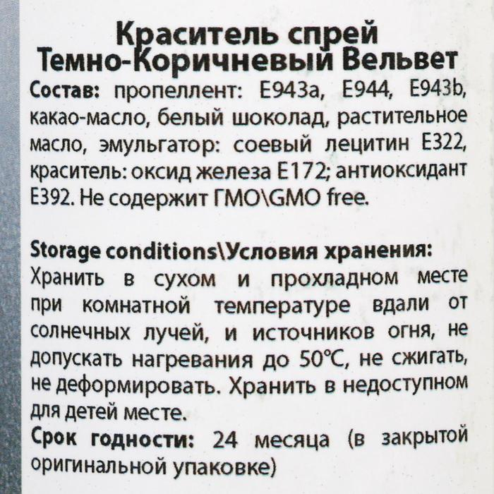 Состав: краситель пищевой, какао-масло, белый шоколад, пропелленты: бутан Е943а, изобутан E943b, пропан E944, антиоксидант Е392.