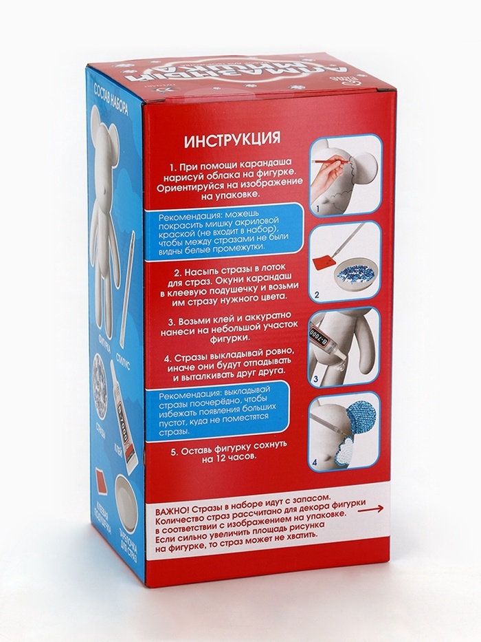 Набор позволит ребёнку смастерить сверкающую игрушку. Малыш с интересом создаст шедевр из ярких страз. Ему понравится не только результат работы, но и сам творческий процесс. Увлекательное занятие поможет развить мелкую моторику рук, усидчивость, внимательность и аккуратность.