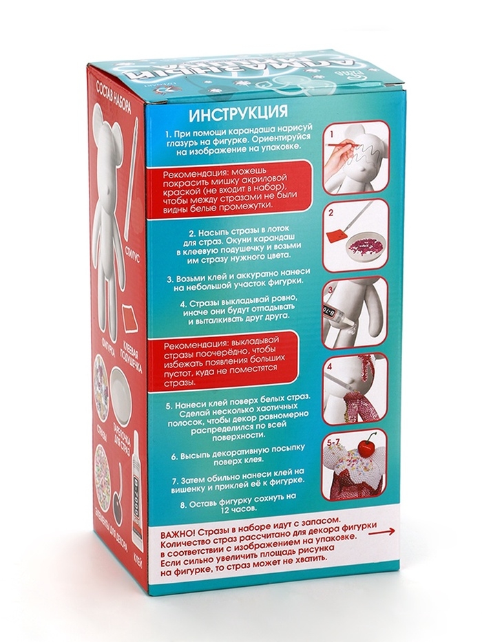 Набор позволит ребёнку смастерить сверкающую игрушку. Малыш с интересом создаст шедевр из ярких страз. Ему понравится не только результат работы, но и сам творческий процесс. Увлекательное занятие поможет развить мелкую моторику рук, усидчивость, внимательность и аккуратность.