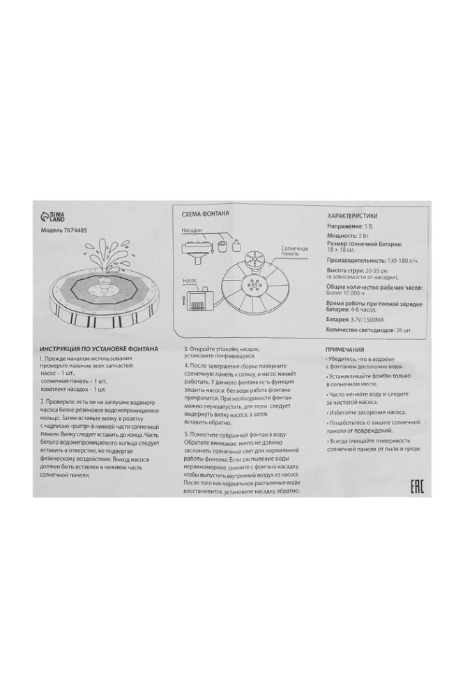 Фонтан на солнечной батарее, h=0,55 метра, 180 л/ч, 7 Вт, LED-подсветка, JT-180-26LED