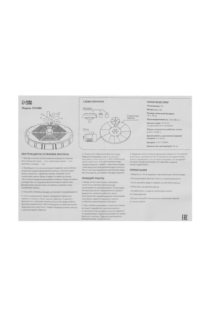 Фонтан на солнечной батарее, h=0,55 метра, 180 л/ч, 7 Вт, LED-подсветка, JT-180-36LED