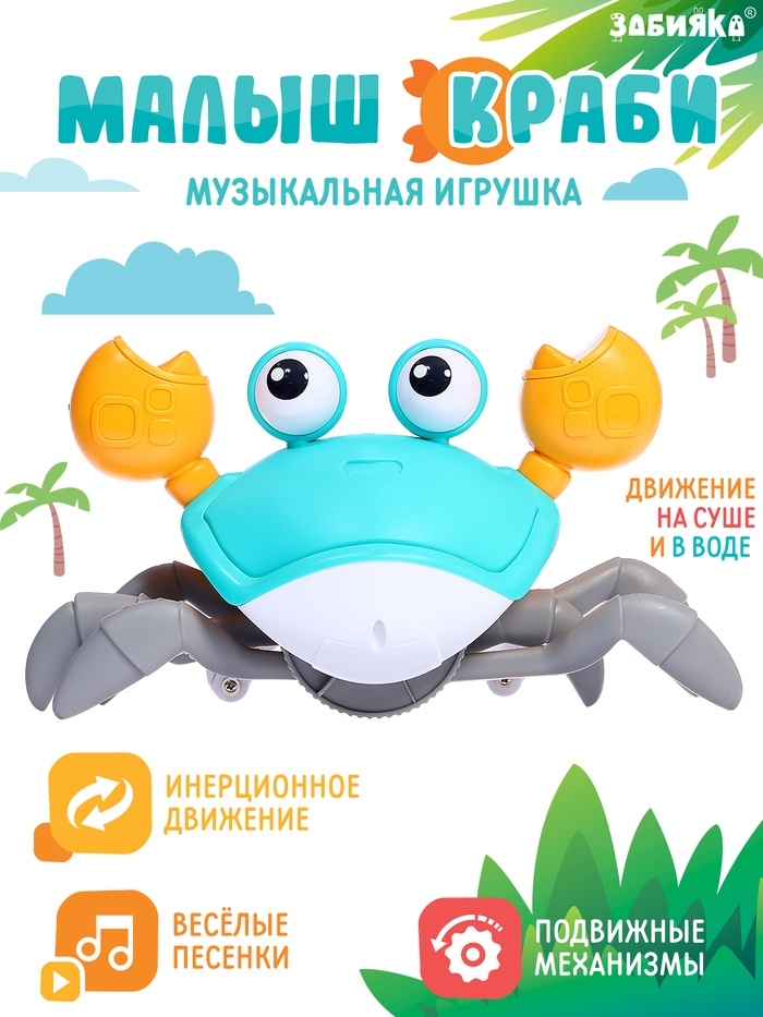 Игрушка «Малыш Краби» станет отличным выбором для активных и любознательных малышей. Эта яркая музыкальная игрушка в форме краба голубого цвета развлекает детей с самого раннего возраста и стимулирует их развитие. Благодаря инерционному механизму, краб двигается по суше и может плавать в воде, превращая игру в увлекательное приключение.
