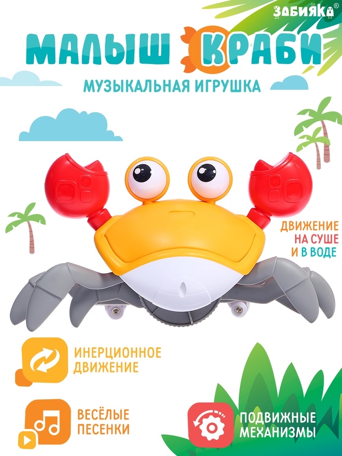 Игрушка «Малыш Краби» станет отличным выбором для активных и любознательных малышей. Эта яркая музыкальная игрушка в форме краба оранжевого цвета развлекает детей с самого раннего возраста и стимулирует их развитие. Благодаря инерционному механизму, краб двигается по суше и может плавать в воде, превращая игру в увлекательное приключение.