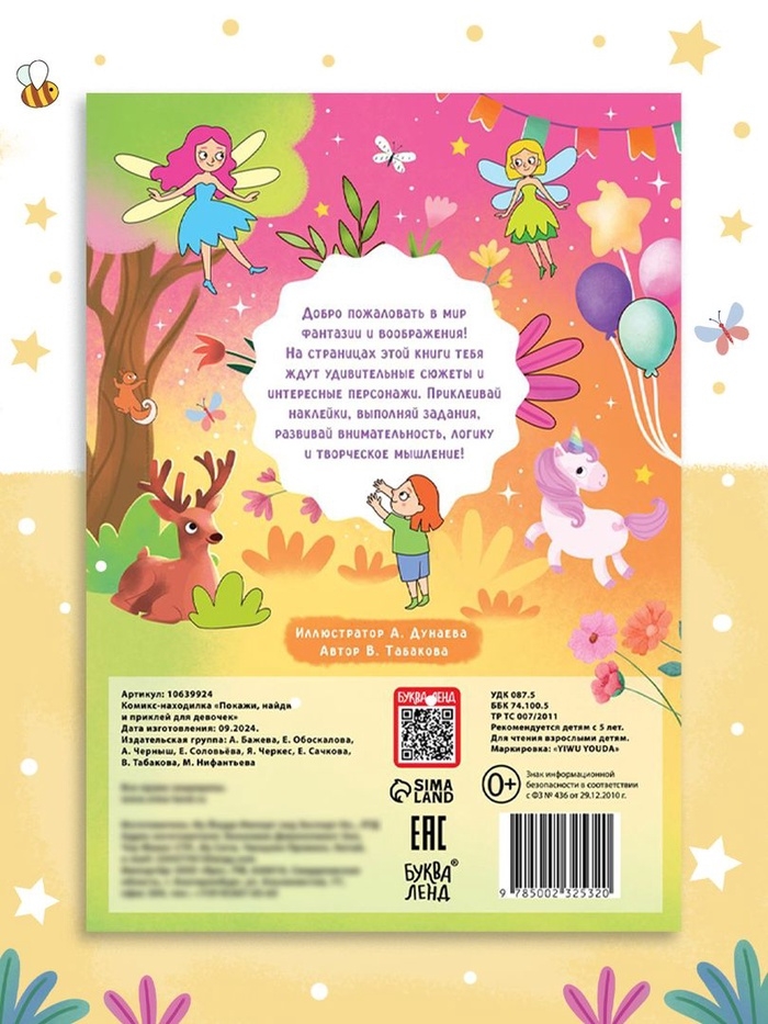 Комикс-игра «Покажи, найди и приклей» для девочек — это увлекательная книга, которая сочетает в себе задания на внимание, творчество и фантазию. Книга предлагает 200 ярких наклек с волшебными животными и другими сказочными персонажами, которые делают процесс игры интересным и разнообразным.