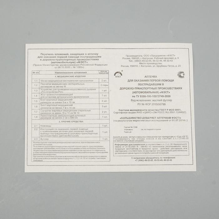 Автомобильная аптечка первой помощи "ФЭСТ" состав 2024, мягкий футляр