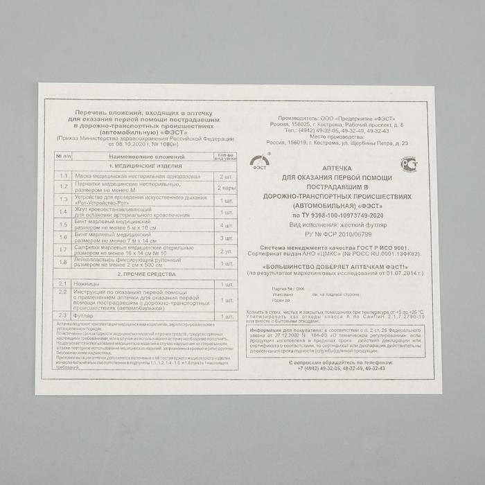 Автомобильная аптечка первой помощи "ФЭСТ" состав 2024, по приказу №1080н