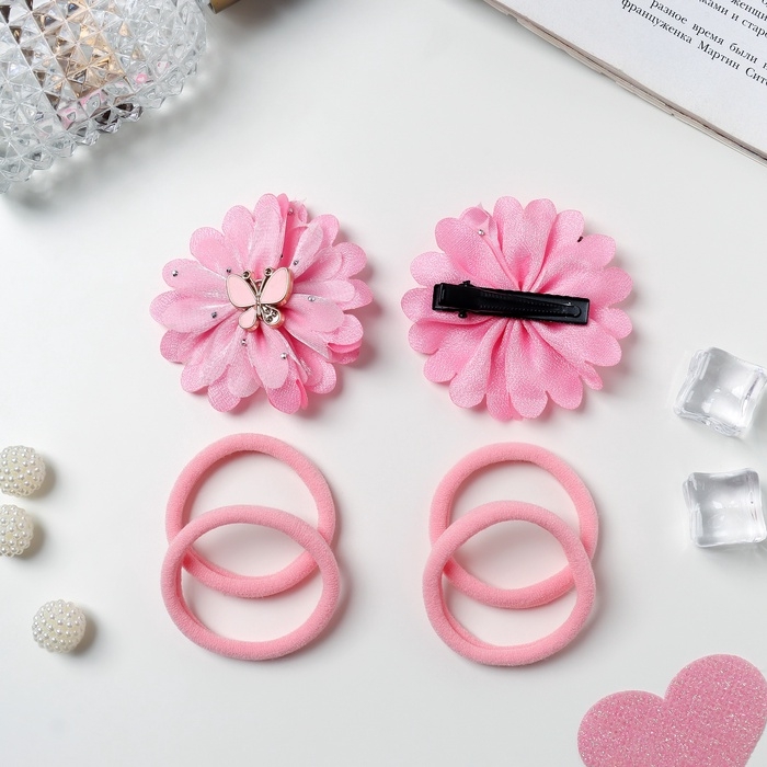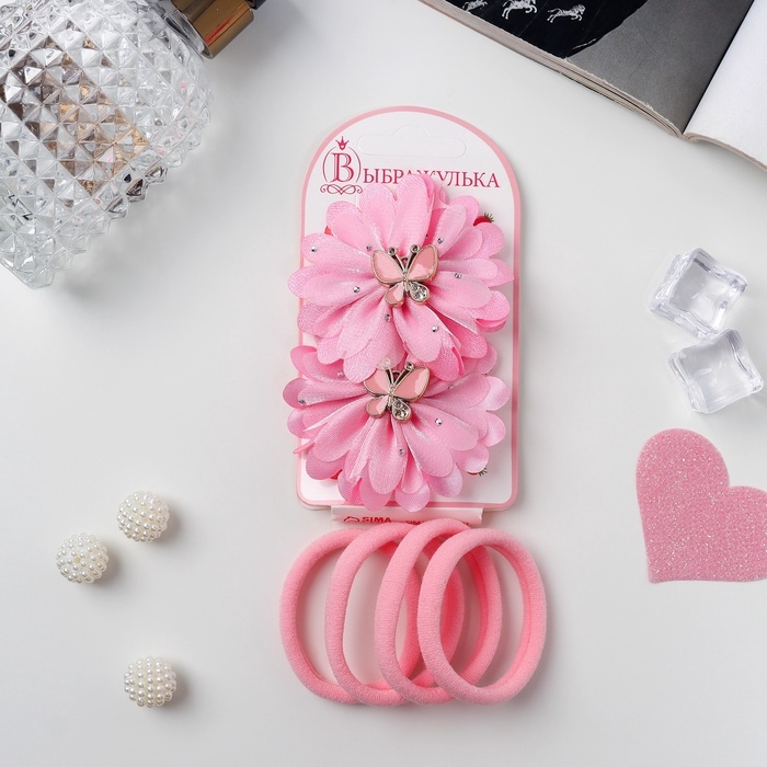 Набор для волос "Кокетка" (4 резинки 4 см, 2 зажима 6 см) нежность бабочка, розовый