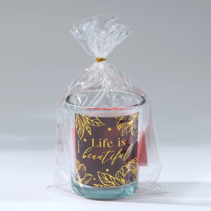 Свеча выполнена в красном цвете, украшена стильной этикеткой с золотыми элементами дизайна и надписью "Life is beautiful".