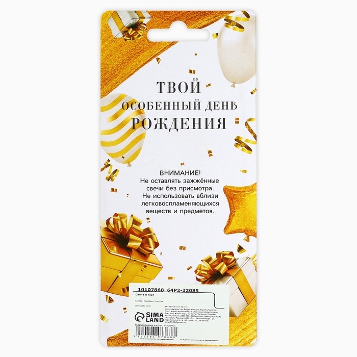 Свечи для торта на День рождения - неотъемлемая часть праздника. Украсьте угощение свечами, чтобы сделать особенный день в году ещё более ярким и незабываемым. Ведь задувание свечей вызывает бурные эмоции и у взрослых, и у детей, потому что в любом возрасте мы все мечтаем об исполнении желаний и для всех нас это один из самых трогательных и волшебных моментов. Яркие свечи украсят праздничный стол и создадут нужную атмосферу. Изготовлены из высокоочищенного пищевого парафина, который не влияет на вкусовые качества блюд, а удобная упаковка помогает сохранять свечи при длительном хранении и транспортировке.