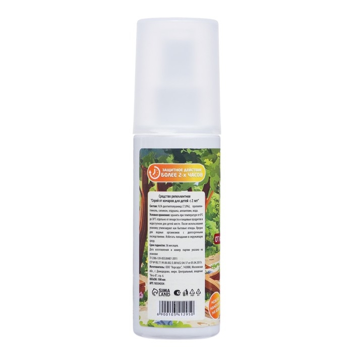 Мягкая и безопасная формула, специально разработанная для нежной детской кожи.Этот детский спрей обеспечит надежную защиту от назойливых комаров и мошек, сохраняя нежную кожу ребенка здоровой и комфортной.Содержит натуральные репелленты, такие как эфирные масла цитронеллы и эвкалипта, которые эффективно отпугивают насекомых без раздражения.Легкая и быстро впитывающаяся текстура, не оставляет жирных или липких следов.Гипоаллергенный и подходит даже для самой чувствительной кожи.Имеет приятный ненавязчивый аромат, который не раздражает обоняние.Удобный флакон с распылителем обеспечивает равномерное нанесение и экономный расход.Безопасен для детей от 2 лет и старше при использовании согласно инструкции.ИнструкцияРаспылить средство на ладонь и обработать открытые участки тела. Для обработки одежды распылить на неё средство с расстояния 10-15 см. Время защитного действия до 2-х часов. При необходимости повторить нанесение.Меры предосторожности и особые указанияНе допускать попадания средства в глаза, рот и на поврежденные участки кожи. В случае попадания - обильно промыть /прополоскать рот водой.Состав: N, N - диэтилтолуамид, пропиленгликоль, силикон, отдушка, аллантоин, вода