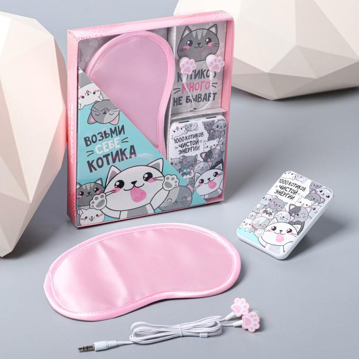 Наушники, маска для сна и зарядное устройство 5000 mAh м. PB-06 «Котики», 20,5 х 16,5 см.