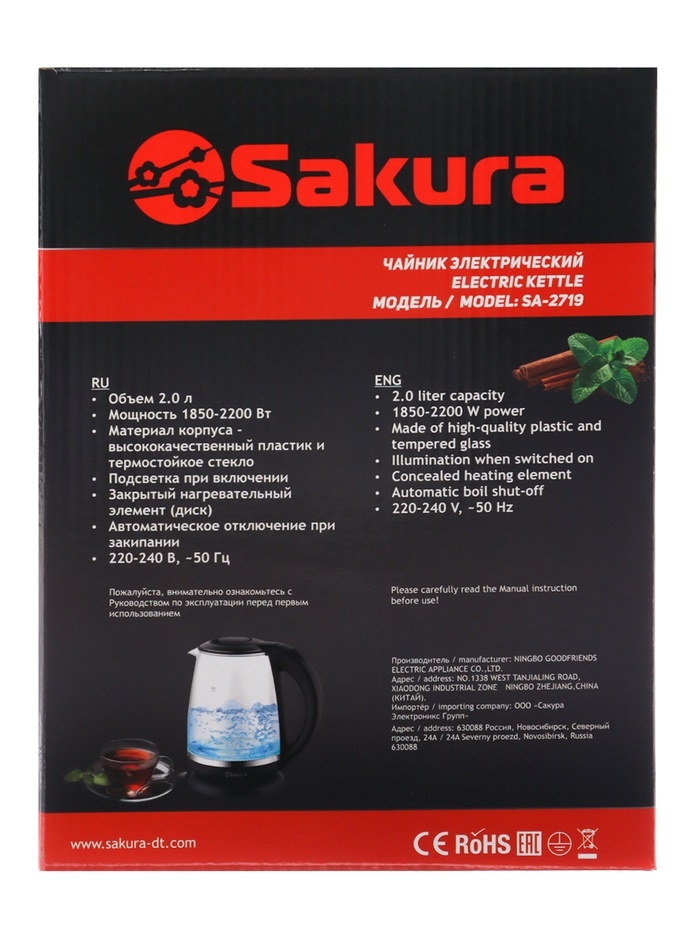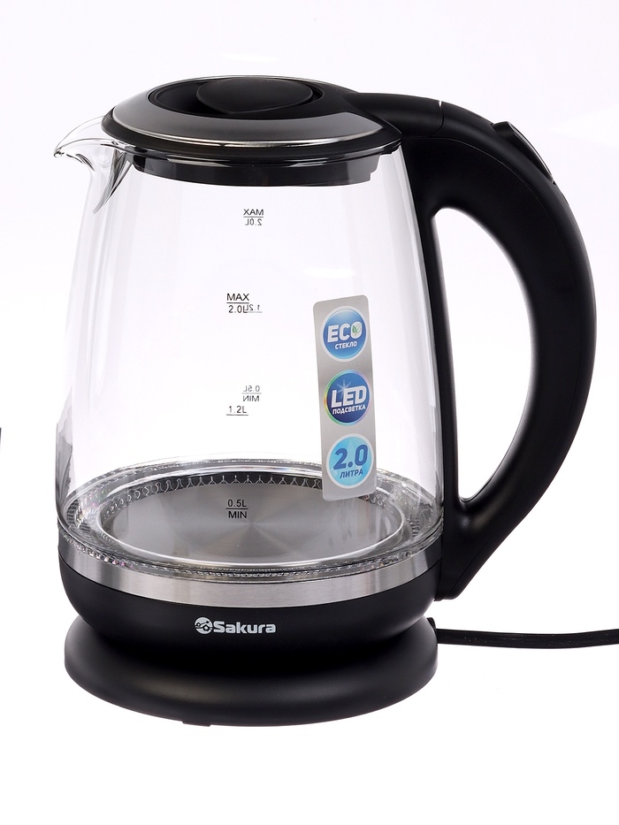 Чайник электрический Sakura SA-2719BK, стекло, 2 л, 2200 Вт, подсветка, серебристо-чёрный