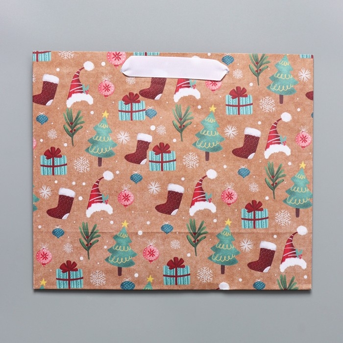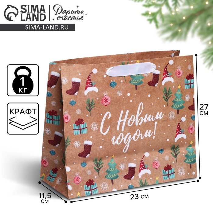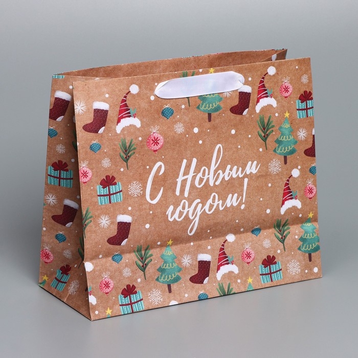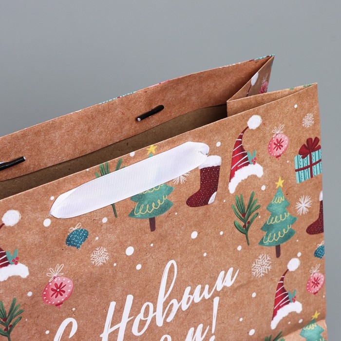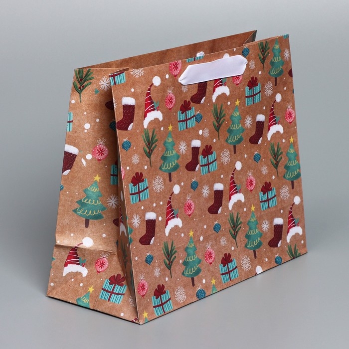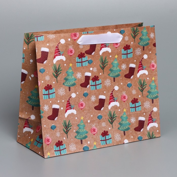 Пакет подарочный новогодний крафтовый горизонтальный «Новогодние подарочки», ML 27 х 23 х 11,5 см
