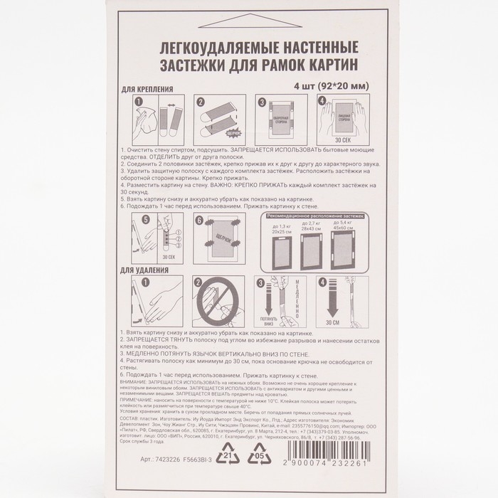 С помощью клейкие застежки Мой выбор ( липучки, крючки на стену, крепеж, полоски) можно легко и безопасно крепить разнообразные аксессуары на вертикальной поверхности. Вы не портите стены, не шумите, не сверлите, никаких лишних движений. При необходимости можно удалить, потянув за клейкую полоску. Благодаря настенным застежкам можно эстетично крепить к стене все что угодно соблюдая весовую нагрузку - роутер, часы, полки, рамки, картины. Одна застежка фиксируется на стене, а другая - на раме. Именно поэтому Вы можете вешать и снимать Ваши фотографии, предметы интерьера столько раз сколько пожелаете. Соблюдайте инструкцию по применению на оборотной стороне упаковки! Подходит для твердых, ровных поверхностей и окрашенных стен. Не подходит для бумажных или виниловых обоев, шероховатых поверхностей.