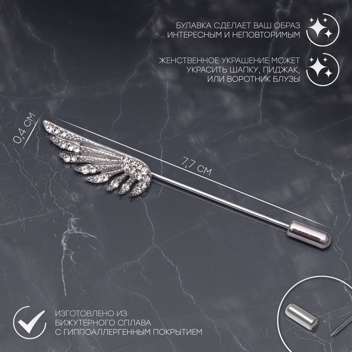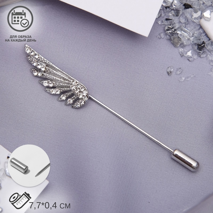 Данная булавка – настоящая находка для модниц, предпочитающих нетривиальные аксессуары. Брошь-булавка станет не только оригинальным дополнением вашего наряда, но и позволит без труда приколоть при необходимости палантин или шейный платок. Используйте её в качестве украшения шляпки, рубашки или галстука. Булавка «Крыло», 7,7 см, цвет белый в серебре внесёт особую нотку изящности в ваш образ.