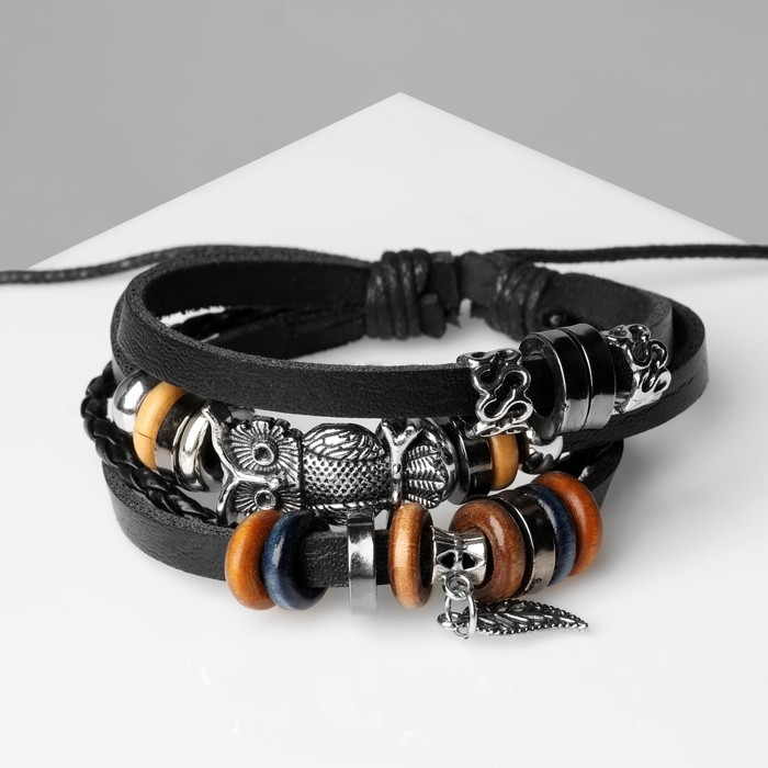 Браслет кожа «Сова» и листок, цвет чёрный, d=6 см