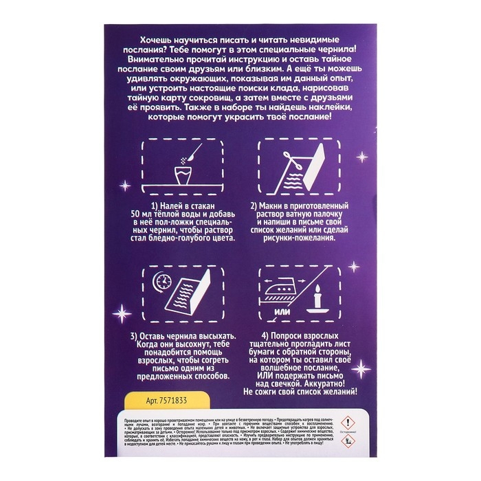 С набором для опытов «Тайное послание» ребёнок научится писать и читать невидимые послания, в этом ему помогут специальные чернила!
