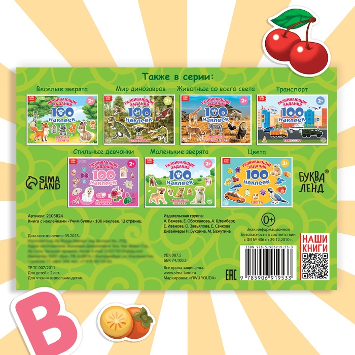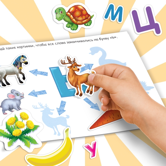 В альбоме представлено 100 наклеек с красочными изображениями букв, животных, насекомых, фруктов, овощей. Яркие картинки положительно влияют на визуальное восприятие малыша, память и воображение.
