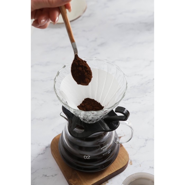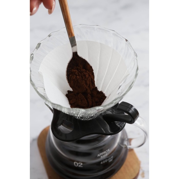 - В увлаженный фильтр положите нужное количество ложек кофе.