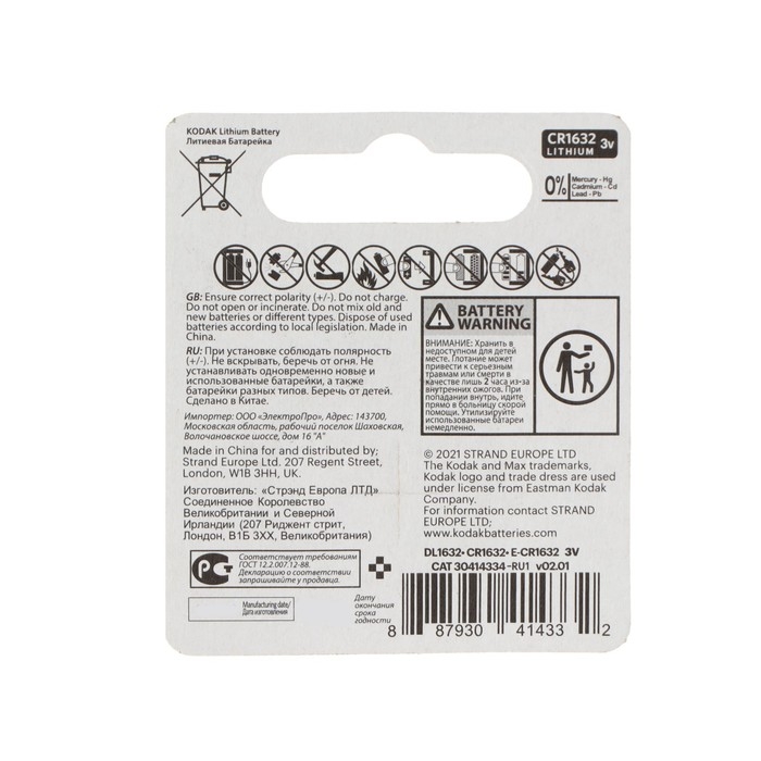 Батарейка литиевая Kodak Max, CR1632-1BL, 3В, блистер, 1 шт.