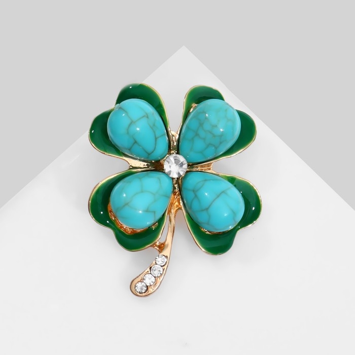 Брошь «Клевер» с бирюзой, цветная в золоте