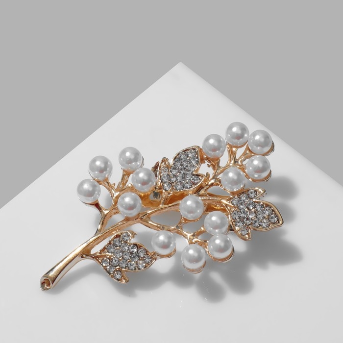 Брошь «Ветка» жемчужных ягод, цвет белый в золоте