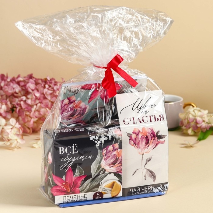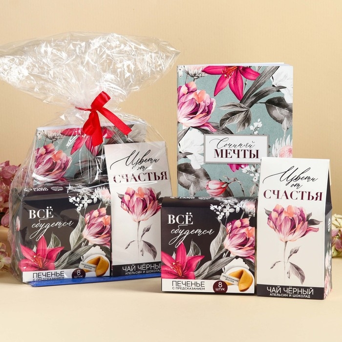 Подарочный набор «Мечты»: чай чёрный со вкусом: апельсин и шоколад 50 г, печенье с предсказанием 8 шт., ежедневник 80 листов