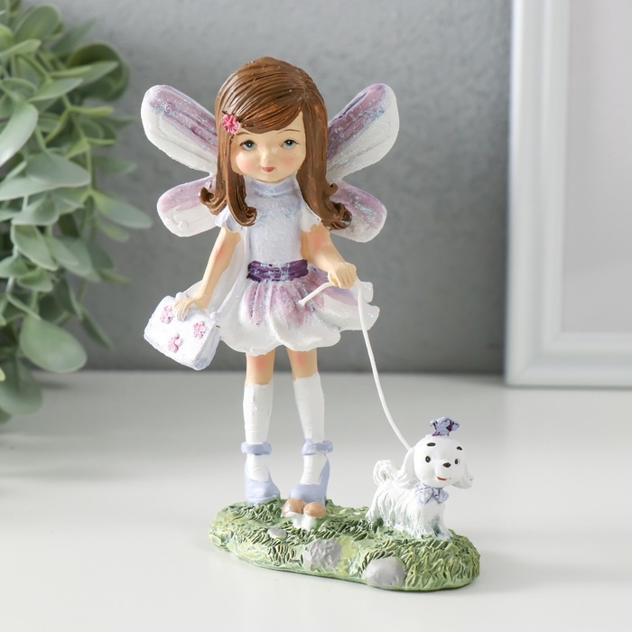 Сувенир полистоун "Малышка в сиреневом платье с крыльями, выгуливает собачку" 10х7х13 см