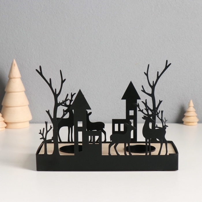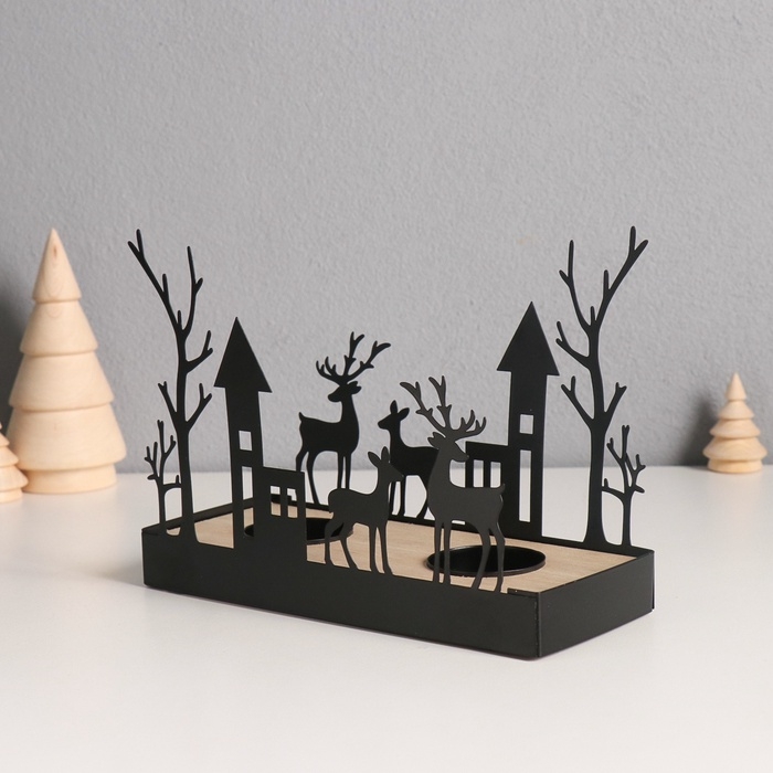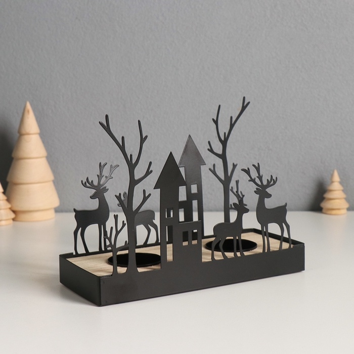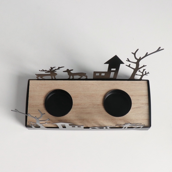 Подсвечник металл, дерево на 2 свечи "Олени и домики" d=4 см 7,5х18х14 см