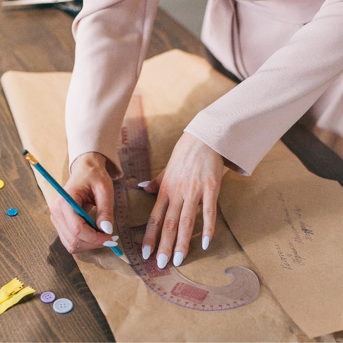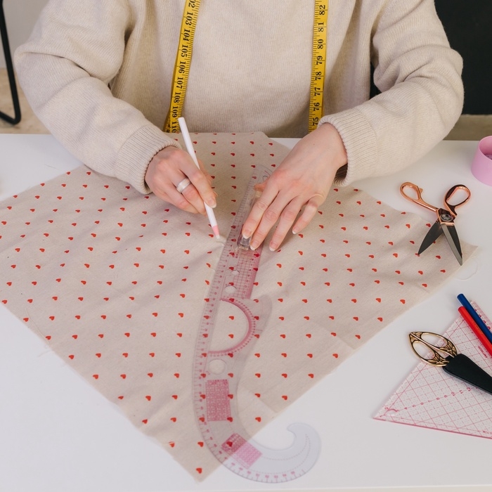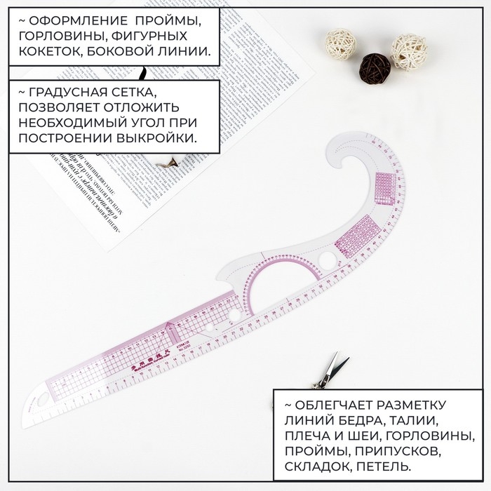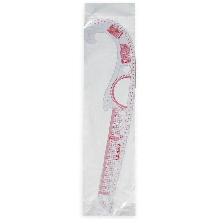 Лекало «Рыбка» облегчает разметку линий бедра, талии, плеча, шеи, горловины, проймы, припусков, складок, петель, фигурных кокеток и боковых линий. Градусная сетка позволяет отложить необходимый угол при построении выкройки.