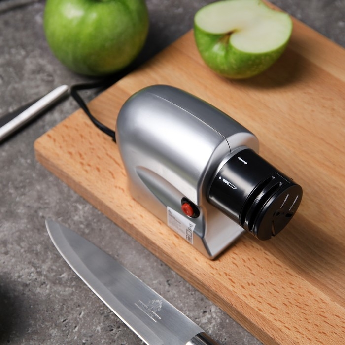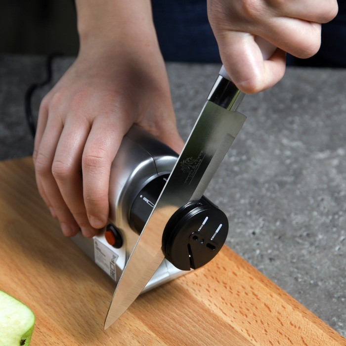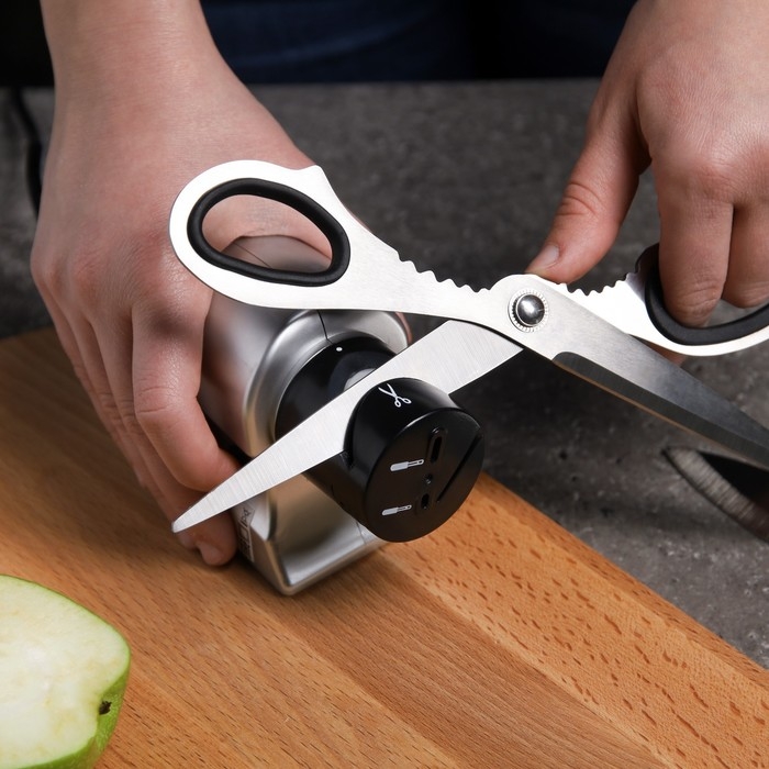Устройство оборудовано несколькими пазами для заточки различных предметов: кухонных ножей с гладким лезвием, ножниц и отвёрток. Для удобства каждый из пазов имеет обозначение в виде иллюстрации того предмета, который вы хотите наточить. Точилка работает от сети.