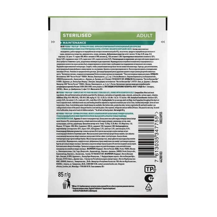 Влажный корм PRO PLAN для стерилизованных кошек, океаническая рыба в желе, пауч, 85 г