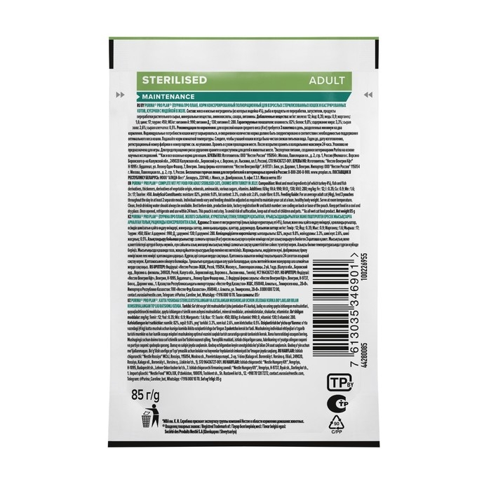 Рекомендации по приготовлению/использованию: Для взрослой кошки среднего веса (4 кг) требуется 3 пакетика в день, разделенных минимум на два кормления. Индивидуальные потребности кошки могут варьироваться, и ежедневное количество корма должно быть скорректировано в соответствии с необходимостью поддержания оптимального веса кошки. Подавайте корм комнатной температуры. Следите, чтобы у вашей кошки всегда была чистая свежая питьевая вода.