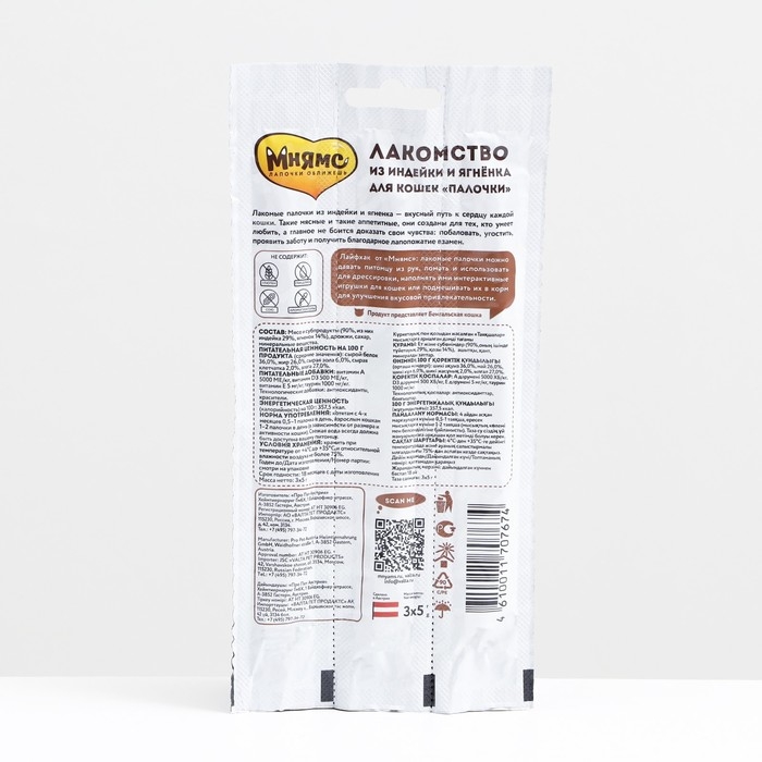 Лакомые палочки Мнямс для кошек, с индейкой и ягненком, 3 х 5 г
