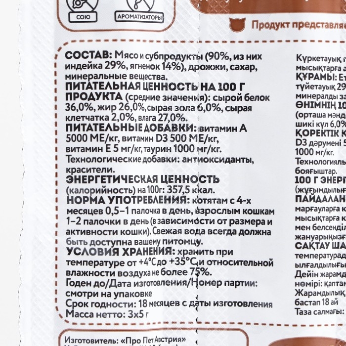 Лакомые палочки «Мнямс» – это аппетитное и полезное угощение, которое придется по вкусу даже самой привередливой и избалованной кошке. Каждая палочка надолго сохраняет вкус и аромат благодаря индивидуальной упаковке. Ингредиенты: мясо и производные животного происхождения (90%, из них 32% индейка и 15% ягненок), дрожжи, сахар, минералы, производные растительного производные.