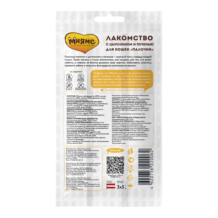 Лакомые палочки для кошек с цыпленком и печенью «Мнямс» – вкусное и здоровое угощение, от которого не откажется даже самая привередливая и избалованная кошка. Каждая палочка индивидуально упакована, что позволяет сохранить запах и вкусовые качества надолго. Без искусственных ароматизаторов и красителей.