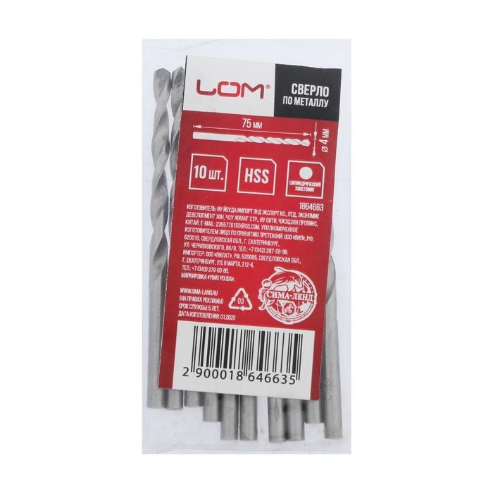 Сверло по металлу ЛОМ, HSS, цилиндрический хвостовик, 4 х 75 мм, 10 шт.
